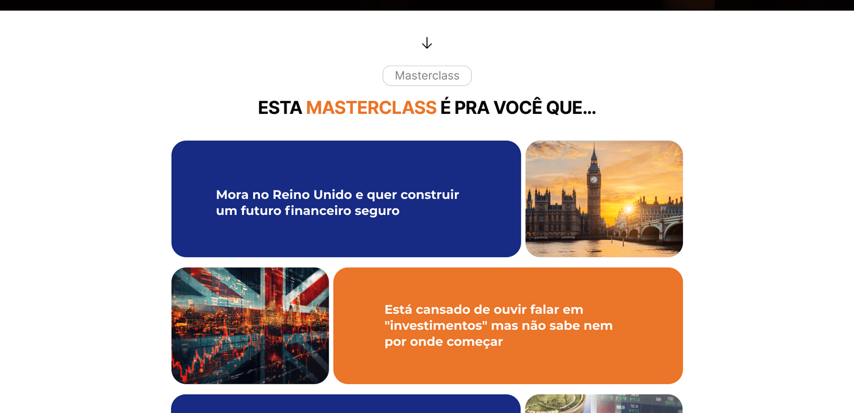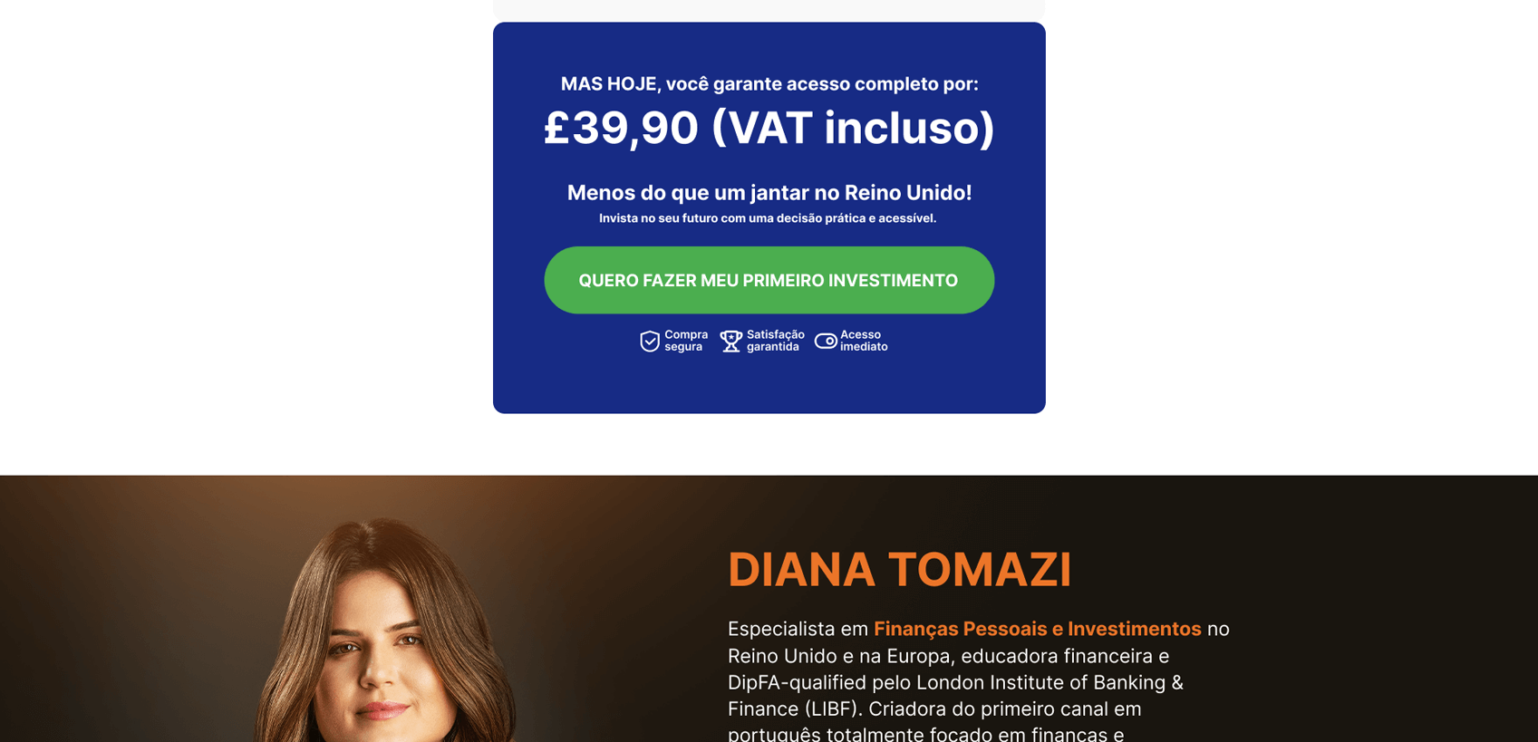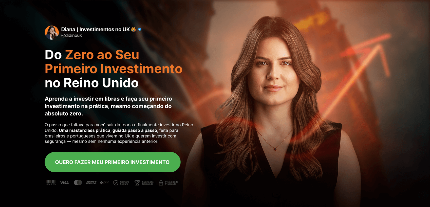 Desenvolvemos a página de vendas para a Masterclass de Investimentos no Reino Unido, conduzida pela Diana, com foco em transmitir clareza e confiança para quem deseja dar os primeiros passos no mercado internacional. Estruturamos a comunicação de forma didática, mostrando dores, objeções e benefícios, enquanto o design reforça a seriedade do tema e incentiva a ação imediata do público interessado em investir.