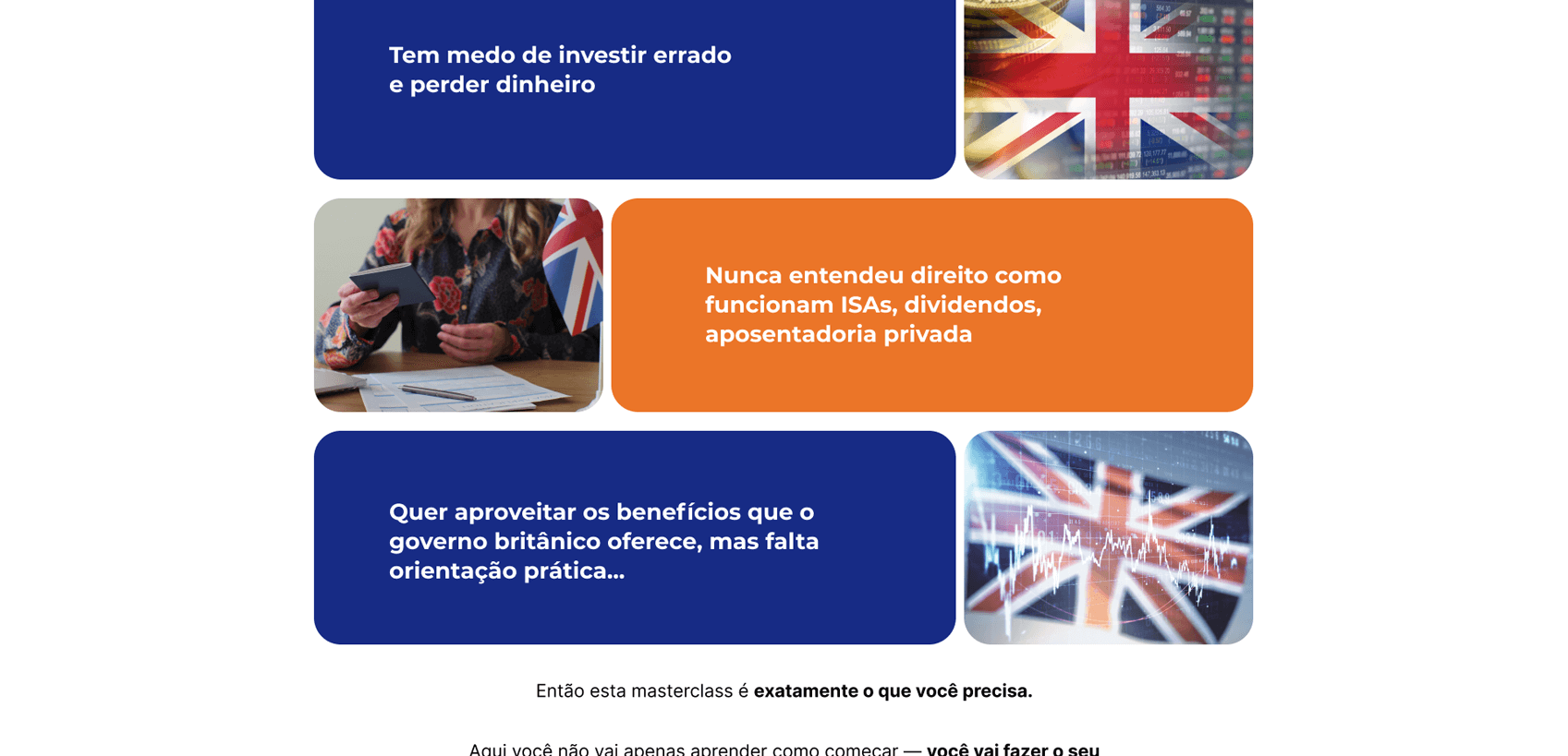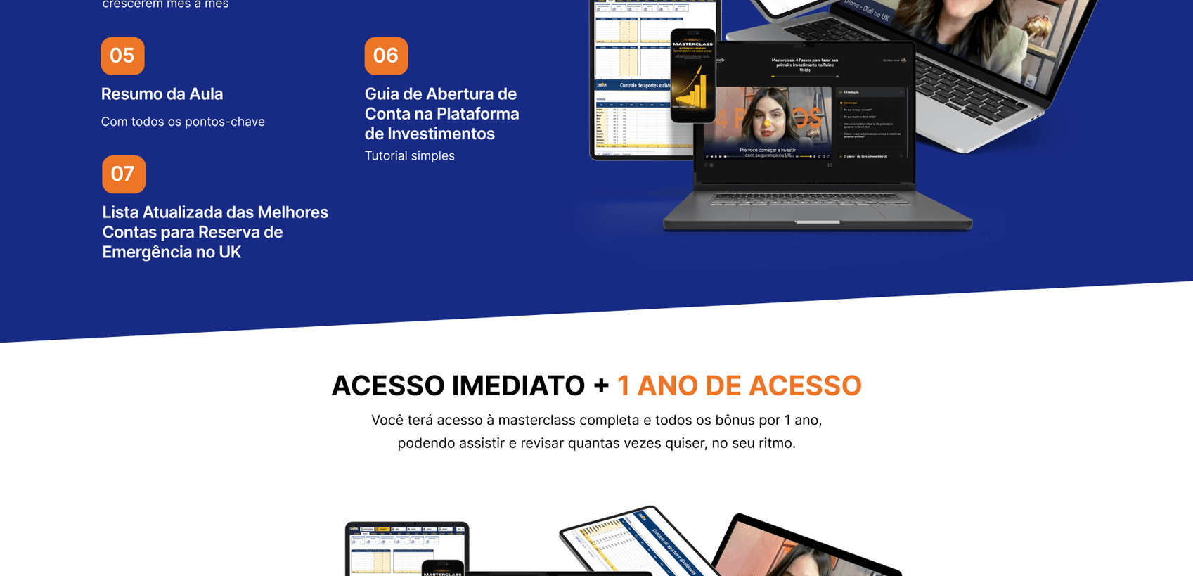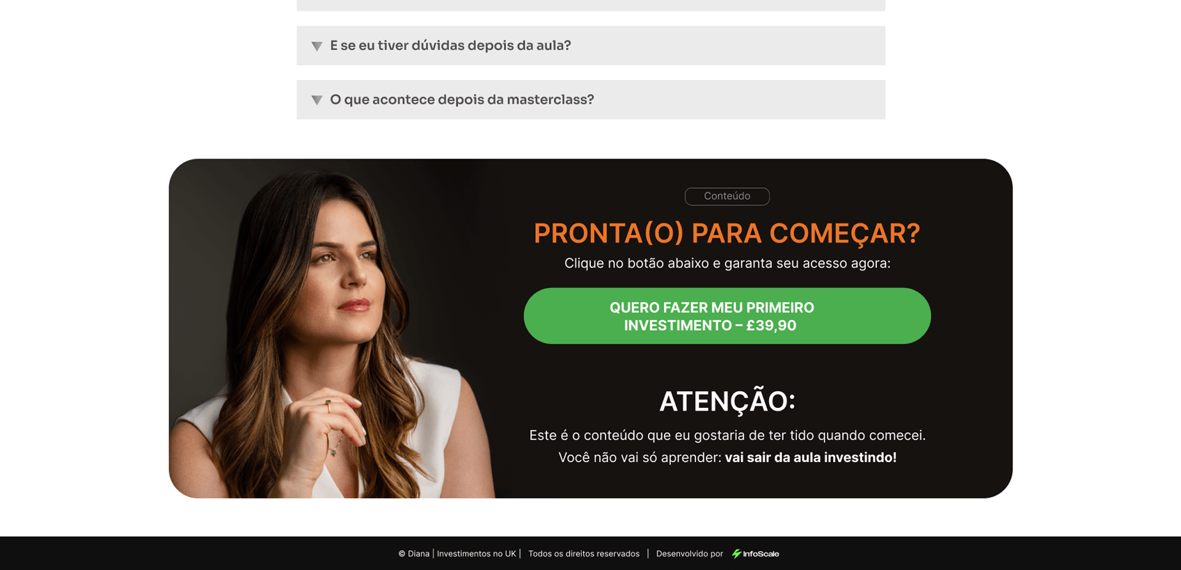 Desenvolvemos a página de vendas para a Masterclass de Investimentos no Reino Unido, conduzida pela Diana, com foco em transmitir clareza e confiança para quem deseja dar os primeiros passos no mercado internacional. Estruturamos a comunicação de forma didática, mostrando dores, objeções e benefícios, enquanto o design reforça a seriedade do tema e incentiva a ação imediata do público interessado em investir.